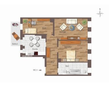 Die ca. 87 m² große Wohnung überzeugt mit einer durchdachten Raumaufteilung: Ein einladender Flur führt in sämtliche Zimmer der Wohnung. Die separate Küche bietet nicht nur Platz für einen Essbereich, sondern auch direkten Zugang zum hofseitig gelegenen Balkon – ein geschützter Ort zum Entspannen im Grünen. Das helle Tageslichtbad ist mit einer Badewanne ausgestattet. Neben dem gemütlichen Schlafzimmer und einem großzügigen Wohnzimmer steht ein weiteres Zimmer zur Verfügung, das sich ideal als Kinder-, Gäste- oder Arbeitszimmer eignet.