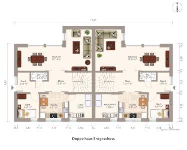 Das Doppelhaus beherbergt 2 Wohneinheiten mit jeweils 123,5 m² Wohnfläche und darf nur zu Dauerwohnzwecken errichtet werden.