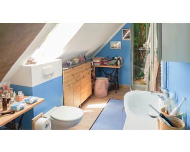 Das Dachgeschoss ist über einen separaten Hauseingang erreichbar und wurde 2019 modernisiert. Offene Holzbalken sorgen für ein gemütliches Wohnambiente. Hier stehen Wohnbereich, eine offene Wohnküche, drei Schlafräume, Ankleidezimmer sowie ein schickes Duschbad mit angrenzendem Hauswirtschaftsraum zur Verfügung. Die Wohnküche verfügt über einen Kaminanschluss.