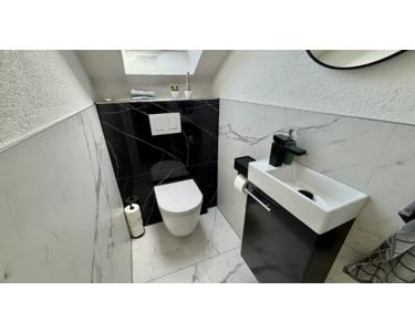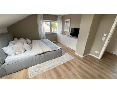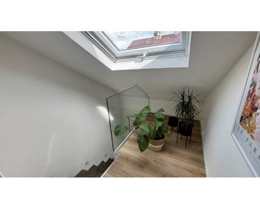 Im Erdgeschoss befindet sich ein großzügiger Wohn-/ Essbereich mit einer offenen Küche und großen lichtdurchflutenden Fenstern, ein Schlafzimmer, das neue Bad mit Badewanne und Dusche und ein Gäste-WC.