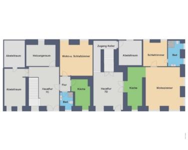 Die rechte Haushälfte ist unterkellert. Im Keller befinden sich der Öltank und die zu den Wohneinheiten gehörigen Kellerabteile. Im EG gibt es einen großen Eingangsbereich und die Zugänge zur kleinen 2RWE sowie der großen 2RWE, welche sich über das 1. OG der rechten Haushälfte erstreckt.
