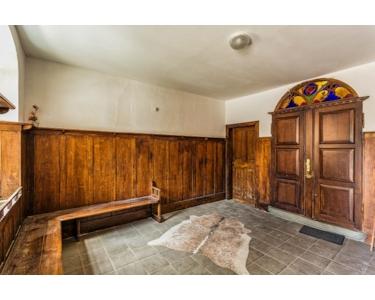 Das helle Treppenhaus links besitzt einen Fliesenboden und ist weiß gestrichen. Der geflieste Vorraum im Hauseingang rechts ist mit einer antik anmutenden Holz-Wandvertäfelung und einer Sitzbank ausgestattet.