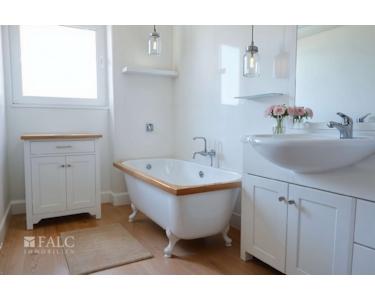 Das Badezimmer ist funktional gestaltet und verfügt über eine Badewanne, ein Waschbecken und eine Toilette. Zusätzlich gibt es ein separates Gäste-WC, das den Komfort für Besucher erhöht.