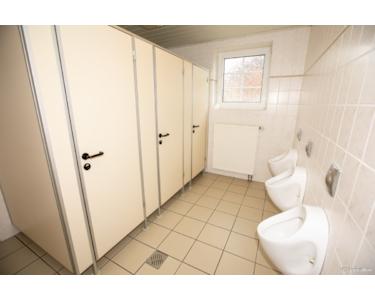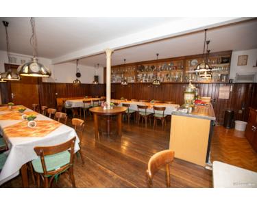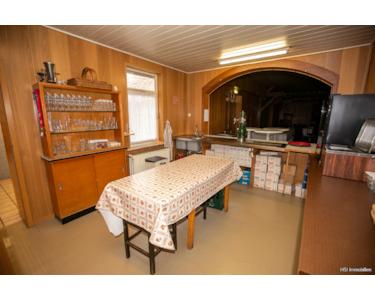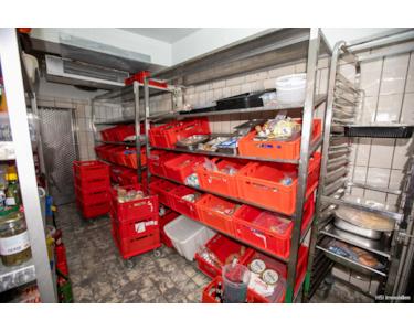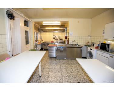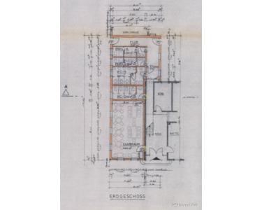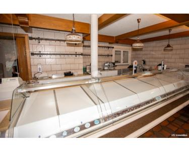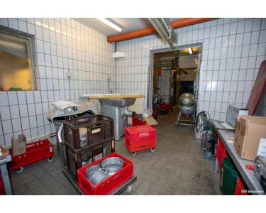 Dazu gehörenden im Erdgeschoss ein Büro, eine Gaststätte mit Clubraum, Sozialräume, eine ehemalige Schlachterei mit Kühlraum und Ladengeschäft.