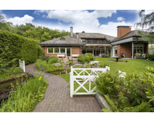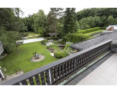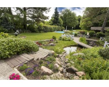 Außenanlagen: Eingezäunter Hauszugang mit Vorgarten, seitliche Zufahrt zu den Stallungen im KG und als Durchfahrt zum Garten. Rückseitiges ca. 2.800 m² großes durch Hecke und Zaun eingefriedetes Grundstück mit großen Rasenflächen, Teichanlage, Gartenhaus, Springbrunnen und beheizter Außenpool mit aufschiebbarem Dach