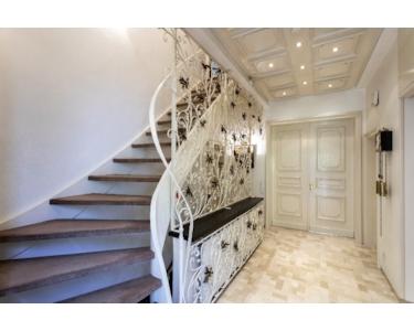 Geschosstreppen: Gewendelte Holztreppe mit Echtholzstufen mit Teppich belegt, Natursteintreppe zum Kellergeschoss, jeweils mit edlem schmiedeeisernen Schmuckgeländer