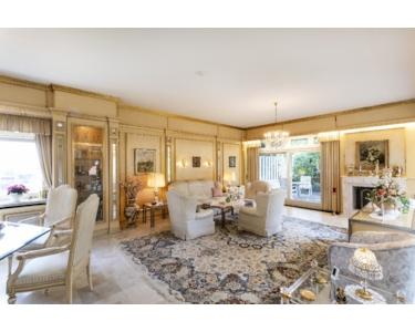 Die ca. 235 m² große Hauptwohnung teilt sich wie folgt auf: Zur linken Seite des Eingangs liegen zwei großzügige Wohnräume: eine elegante Bibliothek mit ca. 44 m² Fläche und ein angrenzendes ca. 54 m² großes Wohnzimmer, das durch große bodentiefe Fensterflächen einen herrlichen Blick in den rückwärtigen Garten eröffnet. Das ca. 40 m² große Esszimmer liegt zentral im Erdgeschoss und ist sowohl mit der Bibliothek als auch mit dem Wohnzimmer und der Küche verbunden. Vom Esszimmer aus gelangen Sie auf die teilüberdachte Terrasse, die zum Verweilen im Freien einlädt und direkt an den wunderschön angelegten Garten anschließt. Über eine Zwischendiele ist das ca. 34 m² große Schlafzimmer mit angrenzendem Tageslichtbad erreichbar. Neben einem herrlichen Ausblick können Sie auch vom Schlafzimmer aus direkt in den Garten gelangen.