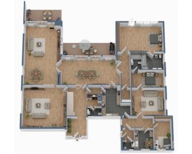 Im großzügig ausgebauten Dachgeschoss stehen Ihnen ca. 167 m² zusätzliche Wohnfläche zur Verfügung. Hier befinden sich drei weitere Schlafzimmer, eines davon mit einem direkt angeschlossenen Tageslichtbad, ein separates Gäste-WC mit Fenster sowie ein sehr großzügiger Wohnbereich mit großer bodentiefer Fensterfront. Von hier aus gelangen Sie auf die etwa 21 m² große Loggia, die einen herrlichen Blick ins Grüne bietet und den Wohnkomfort dieser Etage nochmals unterstreicht.