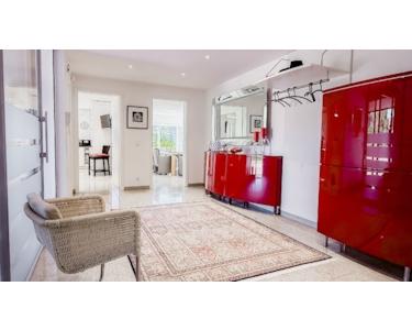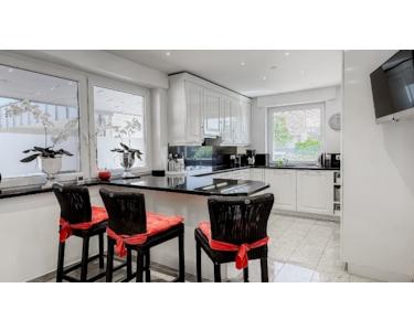 Der nördliche Eingang öffnet das Entrée mit Windfang und Treppenhaus und schafft eine Verbindung zwischen allen Etagen. Von hier aus gelangen Sie durch eine Glastür in den geräumigen Hauptflur. Links liegt die in weiß gehaltene Landhausküche, die mit hochwertigen Elektrogeräten und Granitplatten ausgestattet ist. Ein Durchgang führt von der Küche zum Esszimmer. Durch die Split-Level-Architektur zwischen den Räumen erfolgt eine klare, aber fließende Trennung der Bereiche und sorgt für eine beeindruckende Raumwirkung. Der hochwertige Granitboden, die abgehangenen Decken mit indirekter Beleuchtung u. die maßgeschneiderten Einbauschränke, die sich einheitlich durch den gesamten Bereich ziehen, unterstreichen den exklusiven Charakter des Hauses.