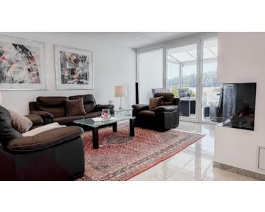 Das rund 47 m² große Wohnzimmer ist nach Süden ausgerichtet u. hat im Zentrum des Raumes einen integrierten Panoramakamin mit angrenzender Bücherwand, der den Raum optisch gliedert u. eine Trennung zum angrenzenden Fernsehzimmer schafft. Vor beiden Räumen ist ein hochwertiger Wintergarten verbaut, mit großflächigen zu öffnenden Echtglaselementen. Dies ermöglicht einen Rundumblick in die grüne Landschaft. Der Wintergarten ist mit einer effektiven Beschattungsanlage ausgestattet und verfügt über einen Außenkamin.