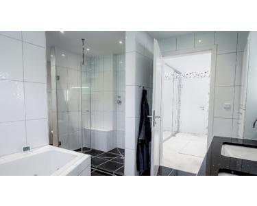 Der im Süden liegende Schlafbereich bietet einen weiten Blick in den Südgarten. Zum Schlafzimmer gehören eine separate Ankleide mit maßgefertigten Einbauschränken für ausreichend Stauraum und ein privates Badezimmer mit ebenerdiger Dusche, Bidet, Urinal, Doppelwaschtisch sowie eine Eckbadewanne mit Whirlpool-Funktion. Ein über 20 m² großes Büro auf der Nordseite im Erdgeschoss kann auch als Schlafzimmer genutzt werden.