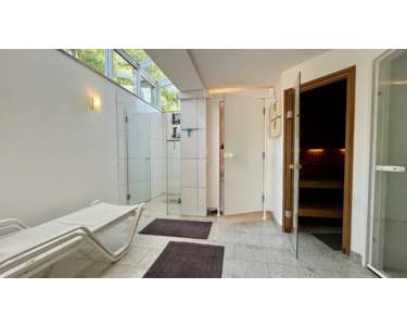 Der Wellnessbereich bietet eine finnische Sauna, ein Dampfbad, einen Ruheraum, einen Duschraum sowie ein WC. Durch die Oberlichtfenster gelangt viel Tageslicht in den Spa- Bereich. Die Ausstattung erfüllt gehobene Ansprüche und ermöglicht Erholung auf hohem Niveau.