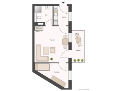 Die Wohnung befindet sich in der ersten Etage und bietet einen interessanten und individuellen Grundriss. Im Eingangsbereich finden sie die kleine Küche. Von hier aus betreten Sie das freundlich geschnittene Wohnzimmer. Ein kleines Schlafzimmer und das modernisierte Duschbad erreichen Sie jeweils direkt vom Wohnzimmer. Große Fenster sorgen für ein schönes Wohlfühlklima.