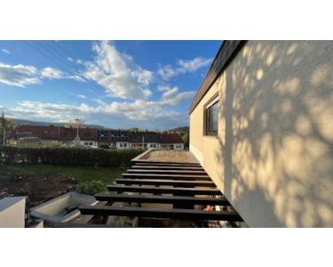 Aufteilung OG - großes Wohnzimmer, offen zum Esszimmer, Küche, WC und ein weiteres Schlafzimmer oder Büro, Zugang zur oberen Terrasse und zum Garten.
