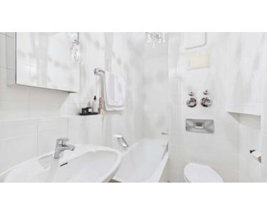 Schon beim Betreten der Wohnung wird deutlich, dass hier auf ein angenehmes Wohnambiente großer Wert gelegt wurde. Der Eingangsbereich liegt auf einer leicht erhöhten Ebene – von hier aus gelangt man zunächst ins Badezimmer mit Badewanne. Über ein paar Stufen führt der Weg weiter hinunter in den weitläufigen Wohn- und Schlafbereich. Dieser offene, helle Raum ist das Herzstück der Wohnung und bietet genügend Platz für Wohn-, Schlaf- und Arbeitsecke.