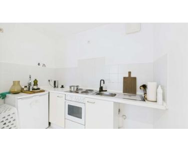 Angrenzend an den Wohnbereich befindet sich die separate Küche, die durch eine Tür abgetrennt ist. Auch hier gibt es ausreichend Platz, um zusätzlich eine gemütliche Essecke einzurichten. Die Küche ist damit nicht nur funktional, sondern auch ein geselliger Ort zum Kochen und Verweilen.