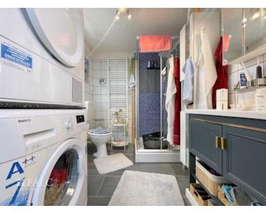Die Fenster sind in pflegeleichten Kunststoffrahmen eingefasst und mit Rollläden ausgestattet, was für zusätzlichen Sicht- und Wärmeschutz sorgt. Der Boden ist überwiegend mit Laminat ausgelegt, was eine warme Wohnatmosphäre schafft und sich leicht reinigen lässt. Im Badezimmer wurden pflegeleichte Fliesen verlegt. Es ist mit einer Dusche, einem Fenster sowie einem Waschmaschinenanschluss ausgestattet und erfüllt damit sowohl praktische als auch komfortable Anforderungen.