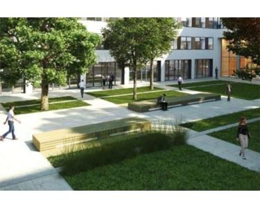 Campuscharakter: Zwei offene, grüne Innenhöfe und begrünte Dachterrassen mit Sonnensegel.