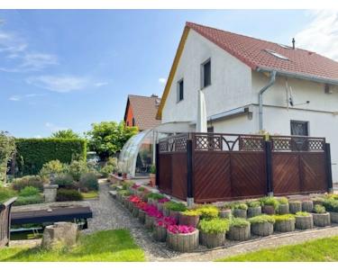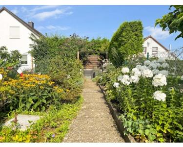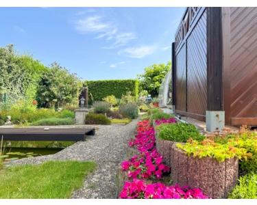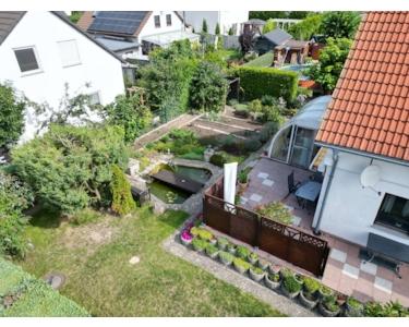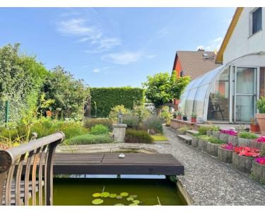 Der Garten ist eine wahre Oase: gepflegt, blühend und mit einem kleinen Teich als besonderem Blickfang. Die Grundstücksgröße bietet genügend Raum für Entspannung und Freizeit, bleibt aber leicht zu bewirtschaften.