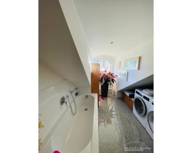 Tageslicht-Badezimmer mit Badewanne, großer Dusche und Waschmaschine mit Trockner.