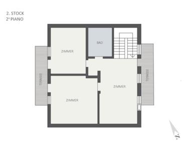 RAUMAUFTEILUNG OBERGESCHOSS - Nettofläche 83,54m²: Eingangsbereich, repräsentativer Wohn-Bereich mit antikem Kachelofen und Zugang zur Südterrasse mit Privatgarten, großzügige Wohnküche, 1 Zimmer, 1 Arbeitszimmer, 2 x großes Bad mit Fenstern, Flur, 2 Balkone in Westausrichtung