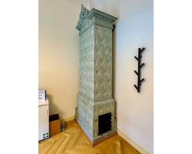 Neben zwei Balkonen, Stuckdecken und Flügeltüren ist ein besonderes Highlight ein historischer Kachelofen.