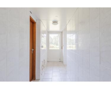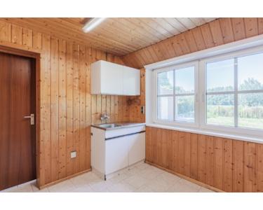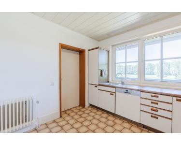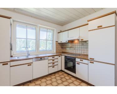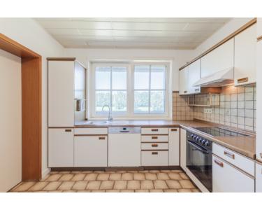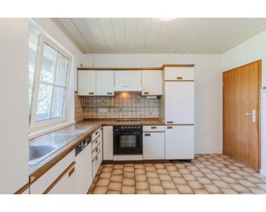 Geschlossene Küche mit älterer Einbauküche inkl. Geräten