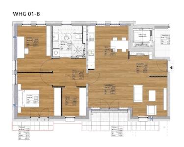 Die Wohnung besteht aus dem hellen Wohn/Essbereich von ca. 38 m² mit integrierter Küche. und Zugang auf die sonnige Terrasse von ca. 9 m². Auf Wunsch kann die Küche offen oder geschlossen gestaltet werden. An den Wohnbereich ist der separate Schlaftrakt angegliedert. Dieser besteht aus dem Elternschlafzimmer von ca. 15 m² mit Ausgang auf die zweite Terrasse von ca.4 dem Abstellraum/Büro/Ankleide von ca. 6 m², einem geräumigen Kinderzimmer/Büro von ca. 13 m² sowie dem behindertengerechten Duschbad mit Fenster von ca. 8 m². Die gesamte Wohnfläche beträgt ca. 102 m². Die Wohnung wurde barrierefrei konzipiert.