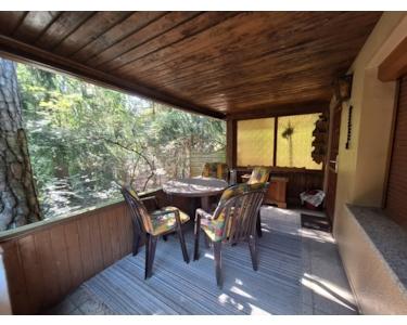 Alle doppelt verglasten Kunststofffenster aus dem Jahr 2015 verfügen über Rollläden zum Verdunkeln. Vor dem geräumigen Wohnzimmer mit festem Kachelofen befindet sich die ca. 15 m² große und überdachte Terrasse. Die Dachpappe auf dem Dach des Bungalows