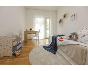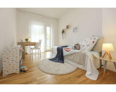 Diese großzügige Einheit bietet vier Zimmer mit einer Wohnungsgröße von ca. 100 m² mit einem großen Wohnzimmer, Schlafzimmer und zwei Kinderzimmern. Zur Wohnung gehören auch das moderne Masterbad mit großer Wellnessdusche und Waschbecken, ein Gäste-WC und eine offene Küche. An die Küche ist eine Speisekammer angegliedert. Vom hellen Wohnzimmer aus mit bodentiefen Fenstern hat man Zugang zum Balkon. Zusätzlicher Stauraum bietet eine Abstellkammer im Kellergeschoß. Die barrierefreundliche Gestaltung der Wohnung ermöglicht ein längeres selbst bestimmtes Wohnen für die ältere Generation.