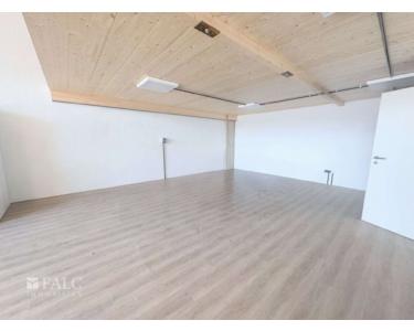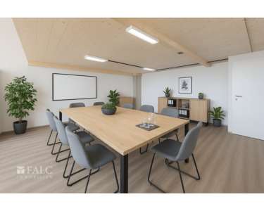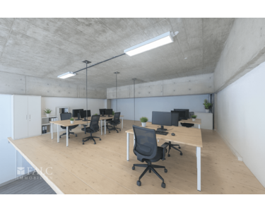 Die Bürofläche befindet sich in einem modernen Loftdesign mit hohen Decken. Wände und Decke sind in Sichtbeton ausgeführt, die Beleuchtung ist in die Betondecke integriert. Der Bodenbelag besteht aus pflegeleichtem und strapazierfähigem Vinyl.
