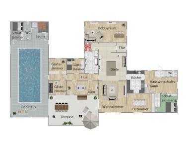Weitere Besonderheiten des Winkelbungalows ist das Poolhaus inklusive Swimmingpool und Sauna, die Photovoltaikanlage auf dem Dach, eine Wärmepumpe und eine neue Gasheizung, die in 2025 erneuert wurde. Auch Ihr Fahrzeug findet in der Tiefgarage einen trockenen Platz.