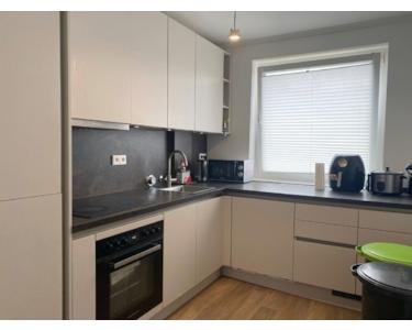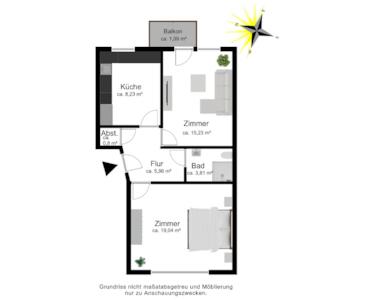 Diese großzügig geschnittene Wohnung befindet sich im 1. Obergeschoss rechts des Hauses. Den Bewohnern stehen zwei geräumige Zimmer, eine moderne Küche sowie ein Duschbad zur Verfügung. Zudem liegt der sonnige Balkon auf der Rückseite des Gebäudes. Ein Abstellraum befindet sich im Keller des Hauses, genauso wie ein Waschküche für die Bewohner.