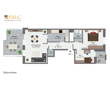 Diese gut vermietbare Erdgeschosswohnung ist eine von insgesamt fünf Einheiten in einem gepflegten Mehrfamilienhaus und überzeugt durch eine durchdachte Raumaufteilung auf ca. 65,16 m² Wohnfläche. Sie verfügt über ein Hauptschlafzimmer, ein Kinderzimmer mit Balkon zur Nordseite, ein Badezimmer sowie eine separate Küche. Der großzügige Wohn- und Essbereich bietet eine hohe Wohnqualität und führt auf eine sonnige Süd-Terrasse, die den Wohnwert deutlich erhöht und bei Mietinteressenten besonders beliebt ist.