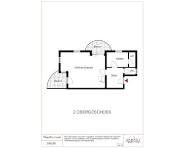 OG: Flur, Gäste-WC, Küche, Ess- und Wohnzimmer, zwei Balkone