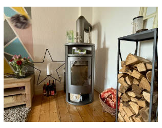 Im Zentrum der Wohnung befindet sich der Wohn-/Essbereich - großzügig, lichtdurchflutet und gekrönt von einem Kaminofen