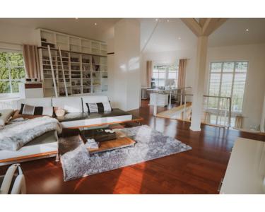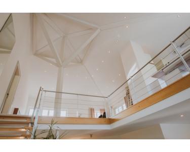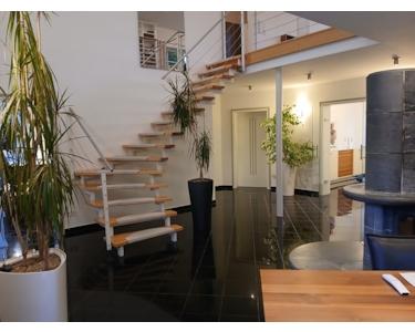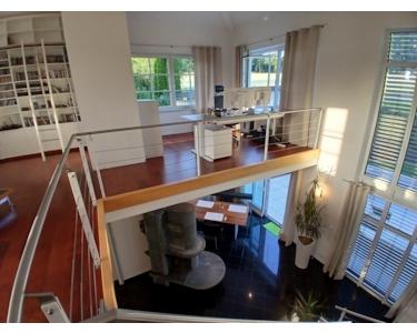 Man erreicht das Anwesen über eine großzügige Treppenanlage. Mit einer Wohnfläche von ca. 200 m², verteilt auf zwei Etagen, bietet dieses Haus ausreichend Platz für die ganze Familie. Insgesamt stehen Ihnen fünf Zimmer zur Verfügung, darunter drei helle Schlafzimmer, die zum Träumen einladen. Ein Highlight des Hauses ist die beeindruckende Galerie mit Sichtdachstuhl im Innenbereich – ein echter Hingucker, der dem Raum Tiefe und Eleganz verleiht.