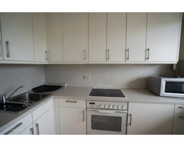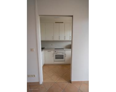 Die Einbauküche in der Farbe Weiß besteht aus Spüle mit Armatur, E-Herd mit Backofen und Ceran-Kochfeld, Unterbaukühlschrank und L-Förmige Arbeitsplatte. Diverse Unterbau- und Hängeschränke sind vorhanden.