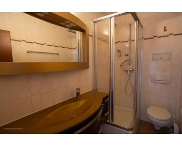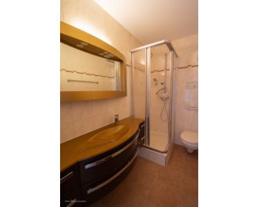 Das innenliegende Bad verfügt über helle, türhohe Wandfliesen mit einer umlaufenden Bordüre, passend zu den terracottafarbenen Bodenfliesen. Eine Duschkabine, eine Toilette, ein Waschtisch mit Einhebelmischbatterie sowie ein Spiegel mit Beleuchtung sind vorhanden.