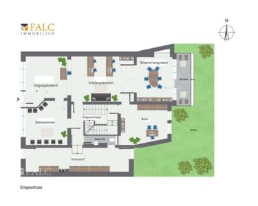 - Erdgeschoss: Empfangsbereich, Wartezimmer, Besprechungsräume mit Zugang zum Garten