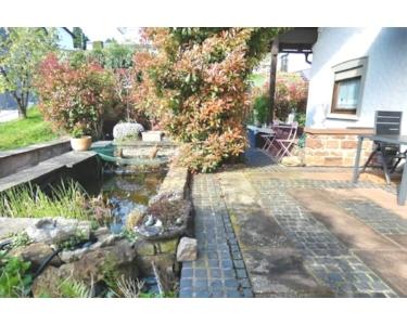 - große Terrasse mit kleinem Teich, seitlich am Haus