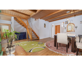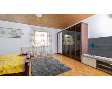 Im Obergeschoss stehen zwei großzügig geschnittene Zimmer zur Verfügung. Von einem der Schlafzimmer aus besteht der Zugang zu einem Balkon mit Blick ins Grüne.