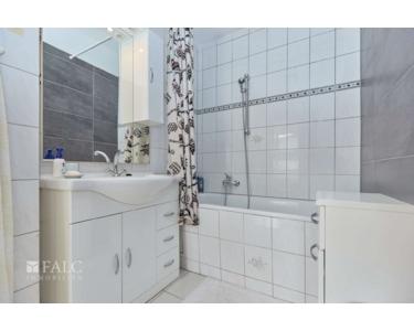 Das Bad mit Badewanne sowie das separate WC sind ebenfalls mit weißen bzw. hellen Fliesen ausgestattet.