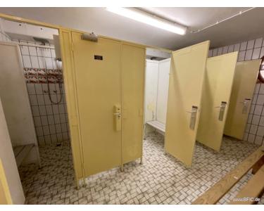 Getrennte Dusch- und WC-Bereiche für Damen und Herren. Baujahr unbekannt, Ausstattung und Sanitärelemente nicht mehr zeitgemäß. Öl-Niedertemperaturheizung aus dem Jahr 1998.