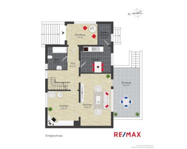 Im Erdgeschoss erwartet Sie eine praktische und funktionale Raumaufteilung mit dem Wohnbereich und direkten Zugang zur Terrasse, die ideal für entspannte Stunden im Freien ist.