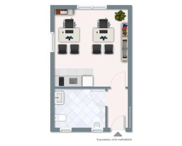 Einheit 1 umfasst rund 41 m² und besticht durch ihre funktionale Raumaufteilung. Beim Betreten der Einheit gelangt man zunächst in einen Flur, von dem aus geradeaus ein kleiner Raum mit integrierter Küche zugänglich ist. Linker Hand befindet sich das Büro, das über einen direkten Zugang zum eigenen WC mit Toilette und Waschbecken verfügt. Zur Einheit gehört ein Kellerbereich mit etwa 26,70 m², welcher aus zwei Räumen besteht: Der erste Raum bietet dank eines Fensters mit Tageslichteinfall die Möglichkeit, ein weiteres kleines Büro einzurichten. Der angrenzende Raum eignet sich hervorragend als Lagerfläche. Die Räume sind beheizt.