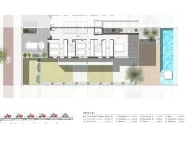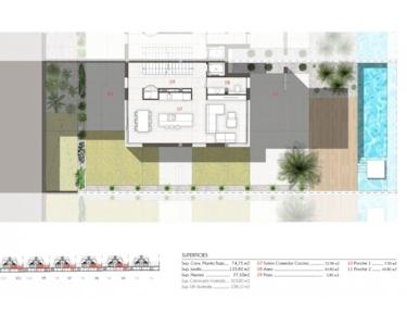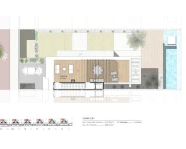 Die angebotene Villa bietet ein enormes Angebot an bebauten Wohn- und Nutzflächen von ca. 238 m² davon Terrassen, Patio und Dachterrasse mit zusammen ca. 105 m², ein Kellergeschoss sowie einen Außen-Pool mit ca. 27 m²!