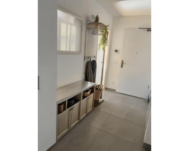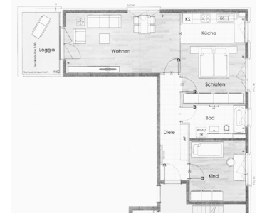 Es begrüßt Sie eine geräumige Diele mit chicen, großformatigen, anthrazitfarbenen Fliesen. Sie führt in den offenen, hellen Wohnraum mit offener Küche und Zugang zu einer sonnigen, großen Loggia, auf der Sie ab Mittag die Sonne genießen können.