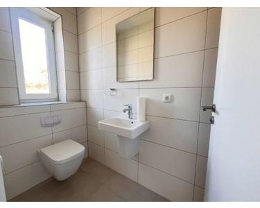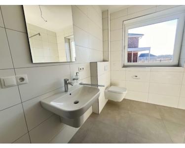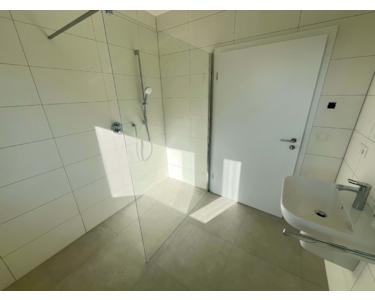 Das Badezimmer wird exklusiv ausgestattet – mit bodentiefer Dusche, Badewanne, modernem Waschtisch mit Möbel, wandhängendem WC und geschmackvoller, deckenhoher Verfliesung. Für Gäste ist ein separates WC vorgesehen. Hochwertige Armaturen und sorgfältig ausgewählte Materialien unterstreichen den gehobenen Anspruch.