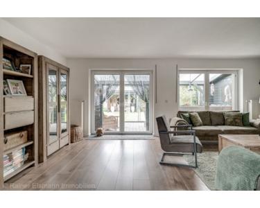 Einladender Wohnraum mit direktem Zugang zur Terrasse und zum Garten. Die überdachte Terrasse erweitert den Wohnbereich in den Sommermonaten und kann bei Bedarf über zwei Heizstrahler beheizt werden.